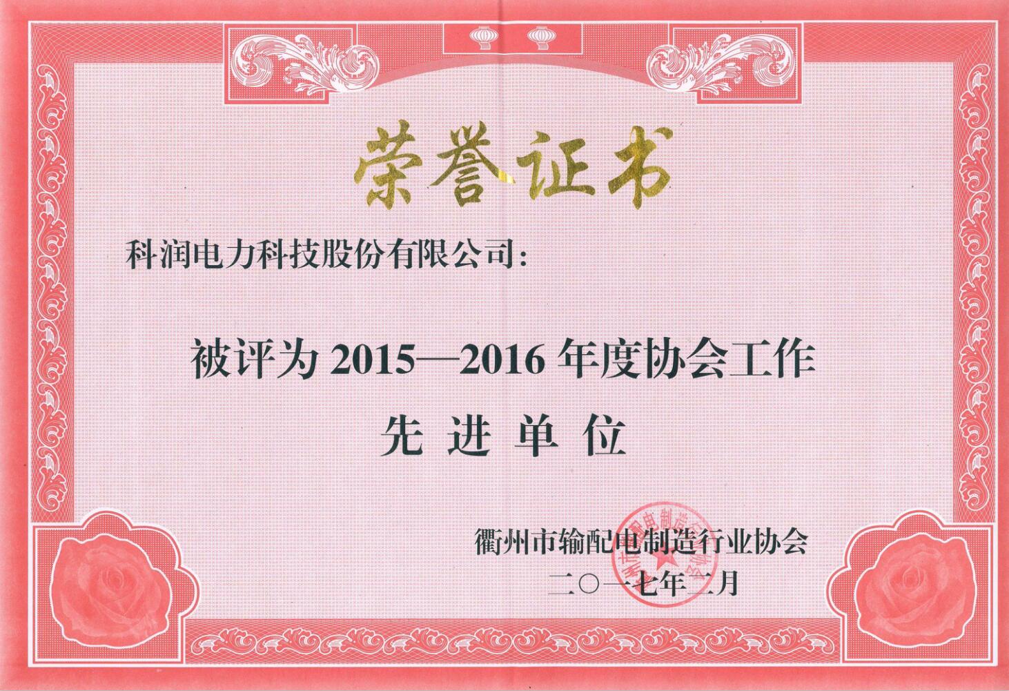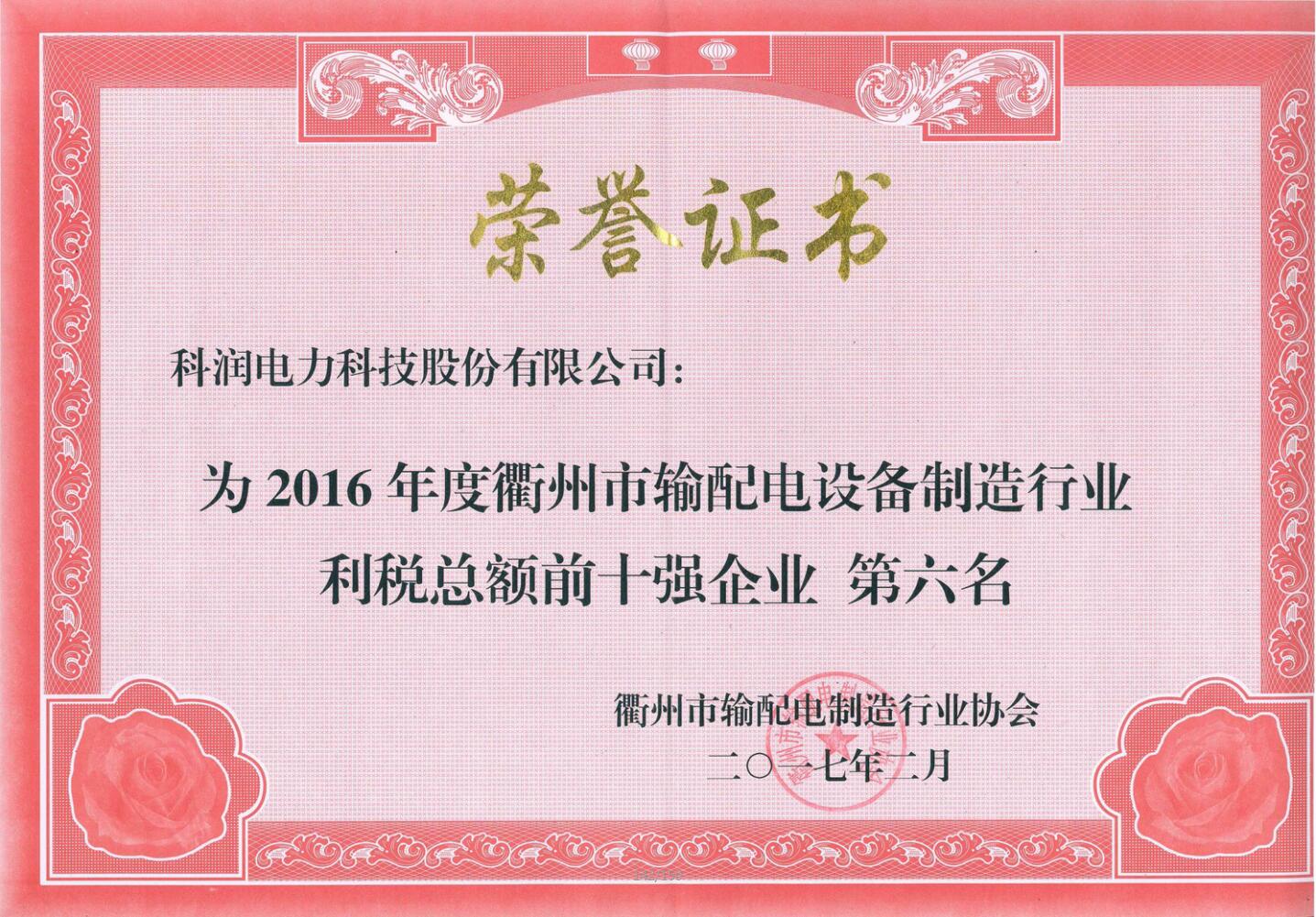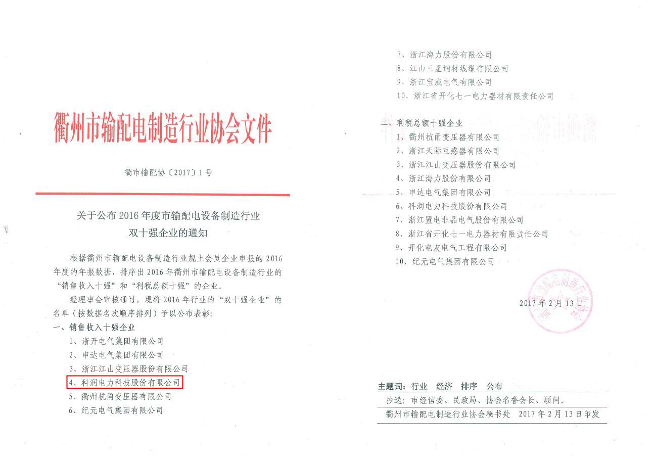 喜訊:恭賀公司榮獲衢州市輸配電制造行業協會年度工作先進單位、雙十強企業
