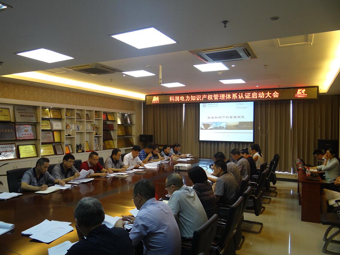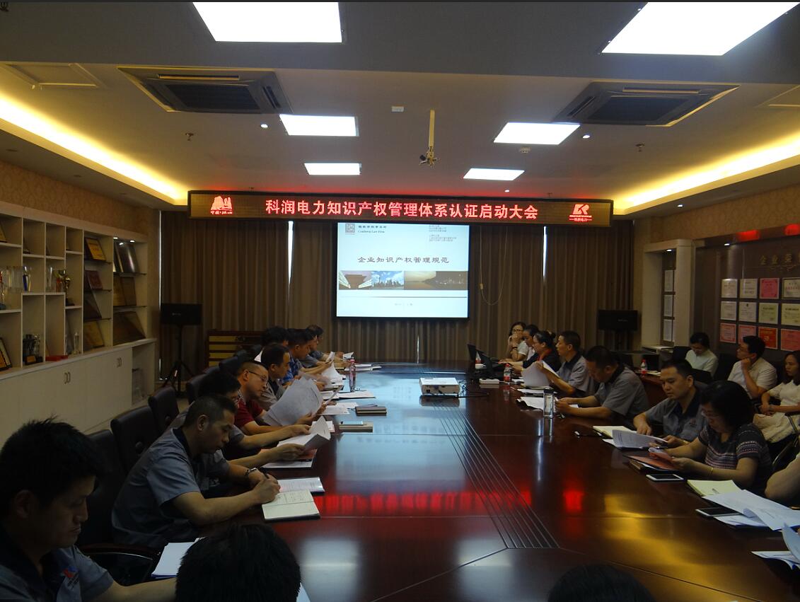 啟動大會由公司總經理章群峰主持,公司各部門、各事業部領導及公司知識產權管理體系籌備小組成員,公司合作伙伴、本次認證工作輔導機構浙江儒毅律師事務所蔣慧青主任和律師團隊成員出席了會議。會上章總經理宣布公司知識產權管理體系籌備小組成員名單與宣讀管理代表任命書、知識產權項目推進計劃、知識產權管理體系認證工作時間表、管理機構與知識產權管理職責、。章總經理作為知識產權管理最高管理者發表了重要的動員講話。他說,今天,我們在這里召開貫徹實施GB/T29490-2013企業知識產權管理體系認證工作動員大會,共同見證科潤電力科技股份有限公司知識產權管理體系認證工作的正式啟動。近年來,科潤電力在認證領域取得了一定的成績,這些體系認證使得我們與客戶的要求、與國際標準逐步接近,提升著公司的質量和信譽管理度,為公司帶來了更多的利潤回報。知識產權管理體系認證是公司又一項提升規范管理的戰略性舉措,是公司創新和規范知識產權的契機和保障。