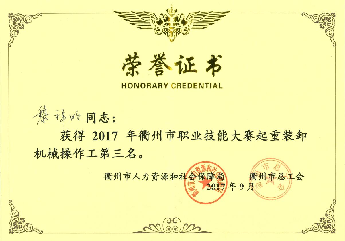 我司員工黎祥明獲得2017年衢州市職業技能大賽起重裝卸機械操作工第三名