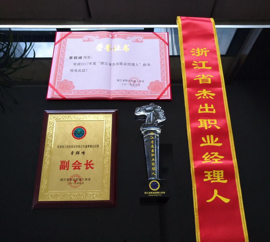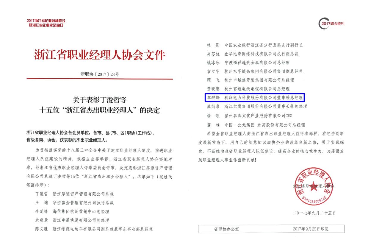 2017年度浙江省職業經理人協會峰會暨一屆五次理事會議在杭州召開,會上揭曉了2017年度浙江省企業家“伯樂獎”5名、“杰出職業經理人”15名、 “優秀職業經理人”25名。我司總經理章群峰榮獲“浙江省杰出職業經理人”。