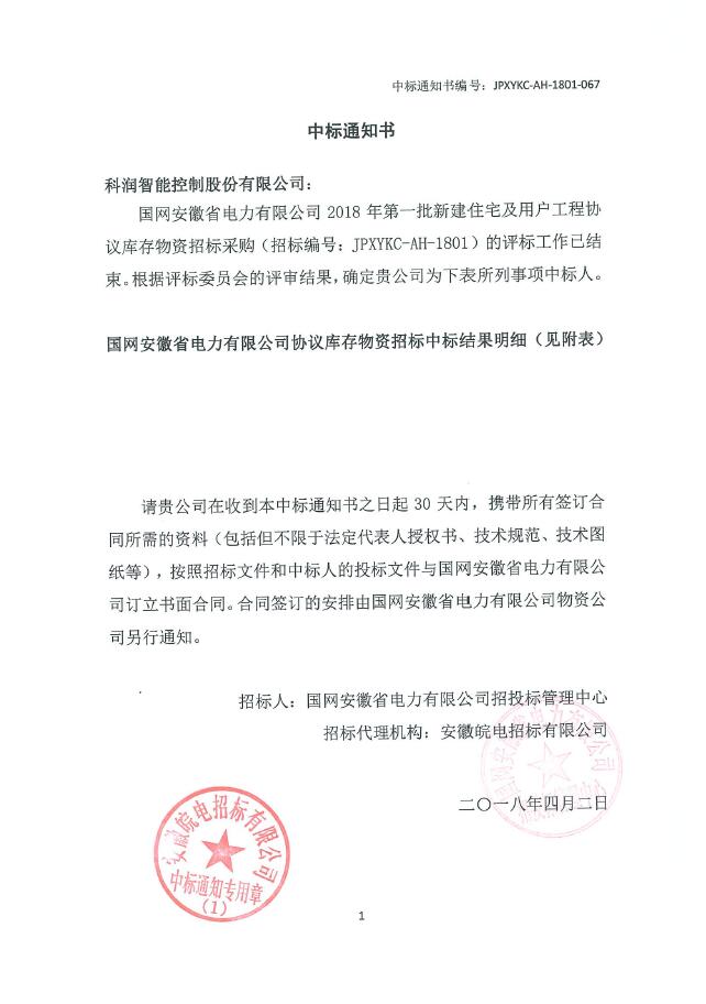 一、國網安徽省電力有限公司2018年第一批新建住宅及用戶工程協議庫存物資招標采購中標結果公布,我司成功中標,中標金額達868多萬元。