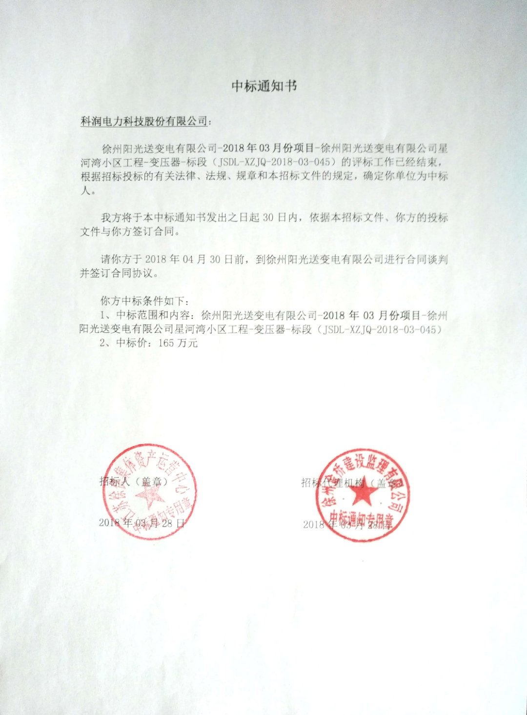 二、徐州陽光送變電有限公司星河灣小區工程物資招標采購,我司又成功中標,中標金額165萬元。