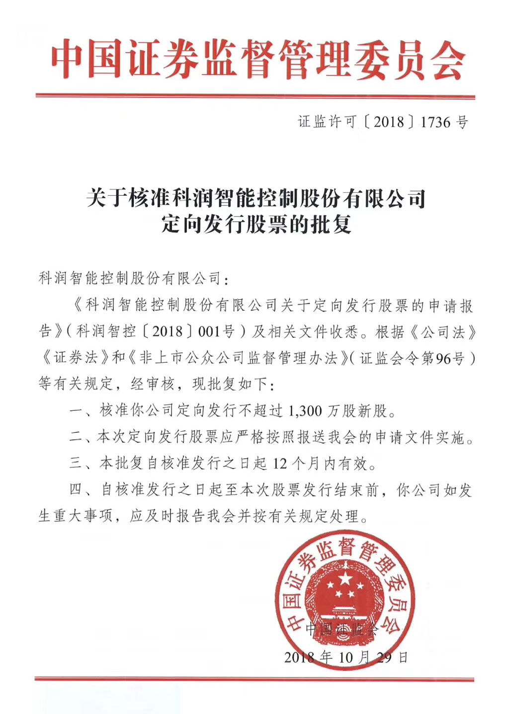 科潤獲證監會“關于核準定向發行股票的批復”。感謝所有關心與支持公司發展的各級領導和朋友,特別感謝證監會,感謝投資機構的信任,感謝江山市委、市政府的堅強領導。科潤團隊定當全力以赴、勇于擔當、不忘初心、砥礪奮進,不辜負所有關心和支持科潤發展的領導、機構和朋友的期望!