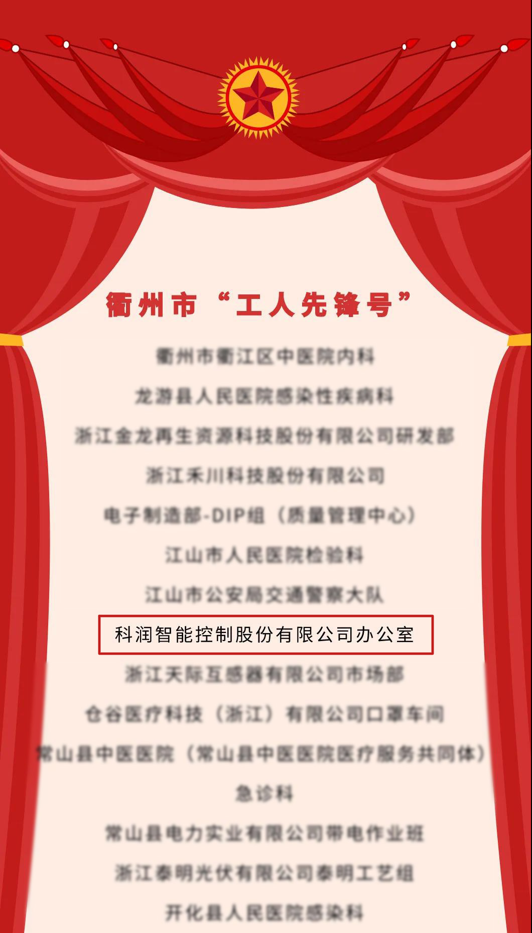 抗擊新冠肺炎疫情戰役打響以來,全市機關企事業單位干部職工積極投身疫情防控和推動企業復工復產工作,涌現出一批沖鋒在前、擔當作為、甘于奉獻的先進集體。為激勵先進,弘揚正能量,衢州市總工會命名衢州市人民醫院感染科等40個先進集體為衢州市“工人先鋒號”。科潤智能控制股份有限公司辦公室就是其中之一。
