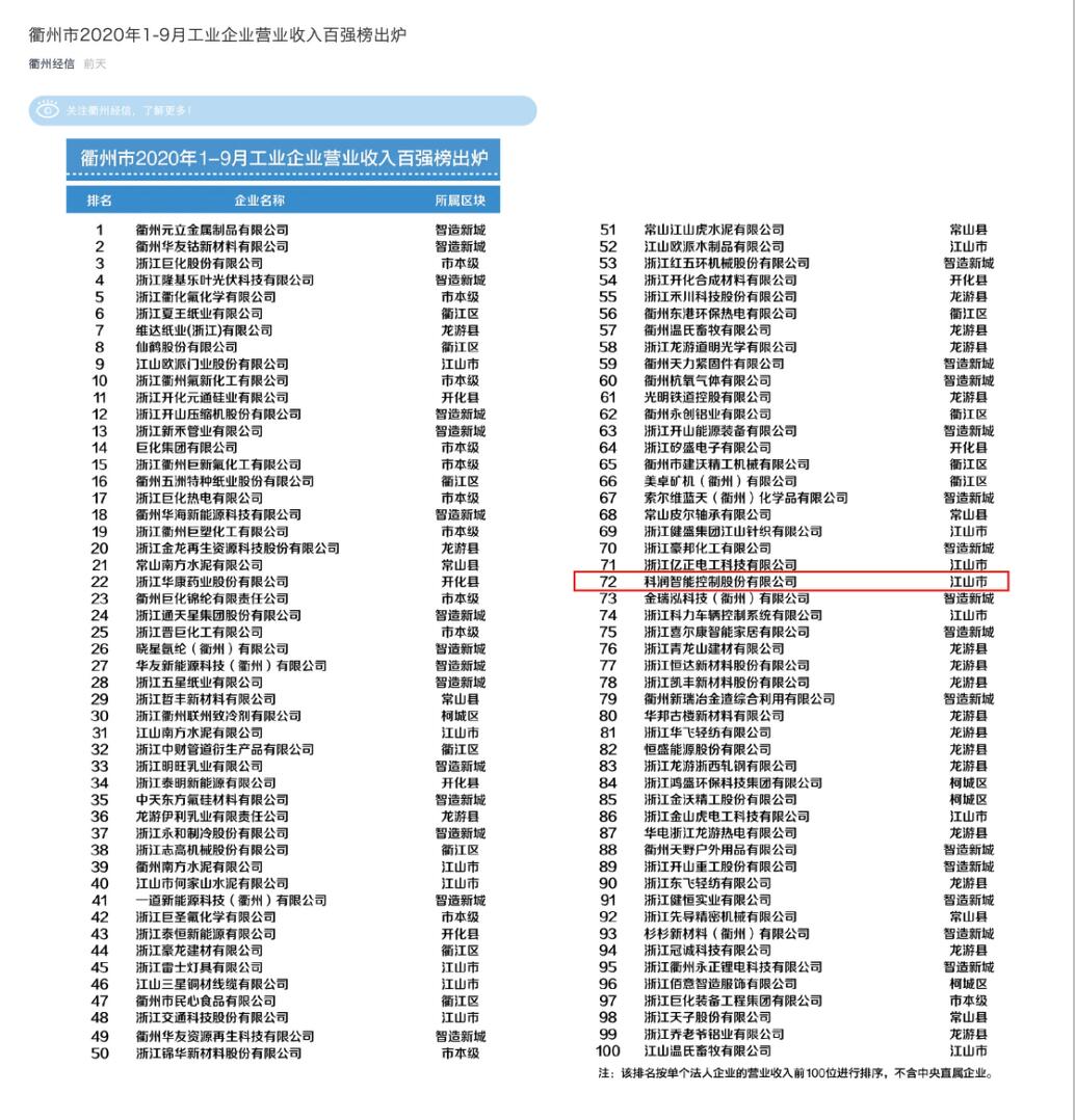 熱烈祝賀科潤智能控制股份有限公司被列入衢州市2020年1-9月工業(yè)企業(yè)營業(yè)收入百強榜。