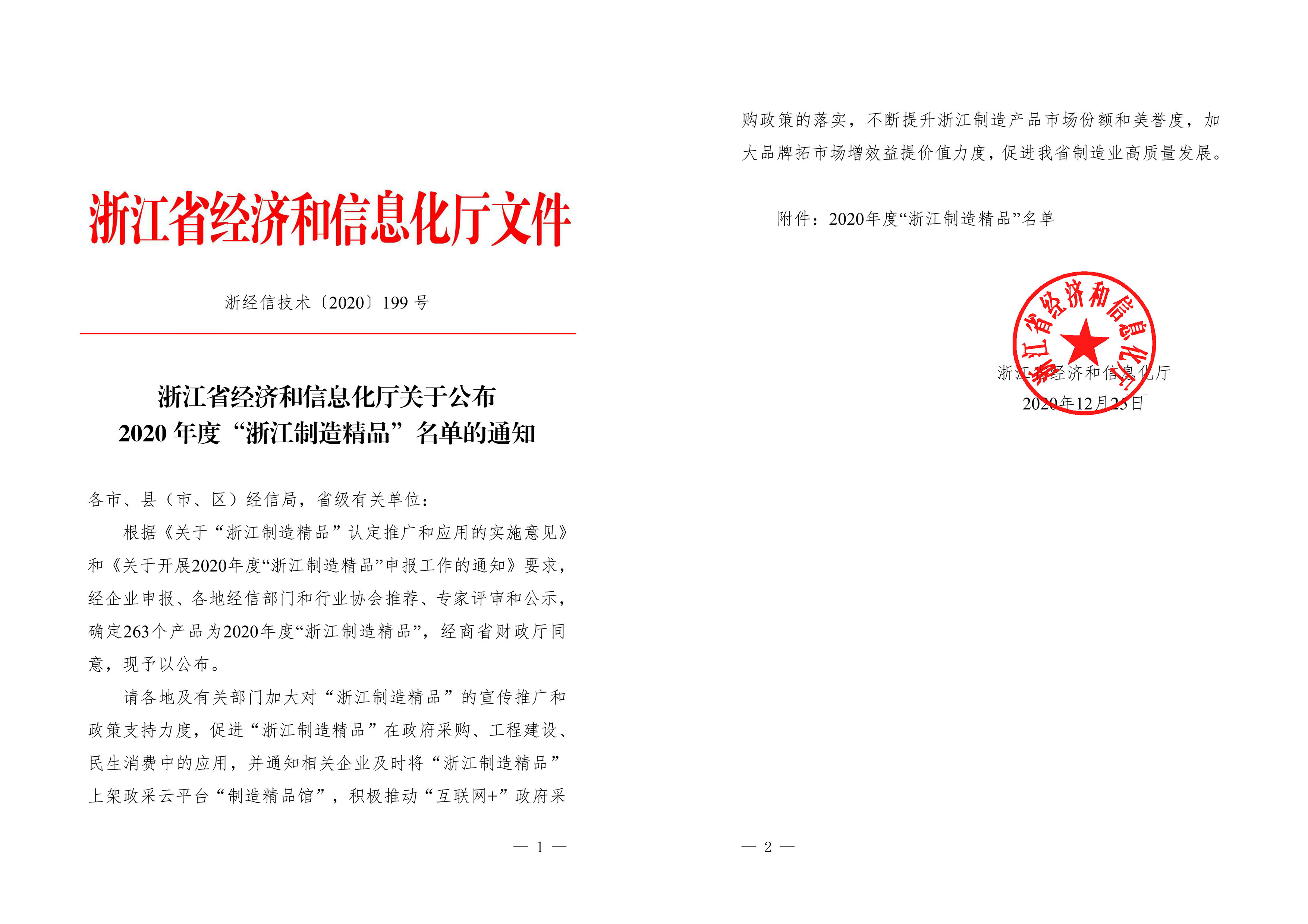 熱烈祝賀公司產品被浙江省經信廳認定為2020年度“浙江制造精品”!