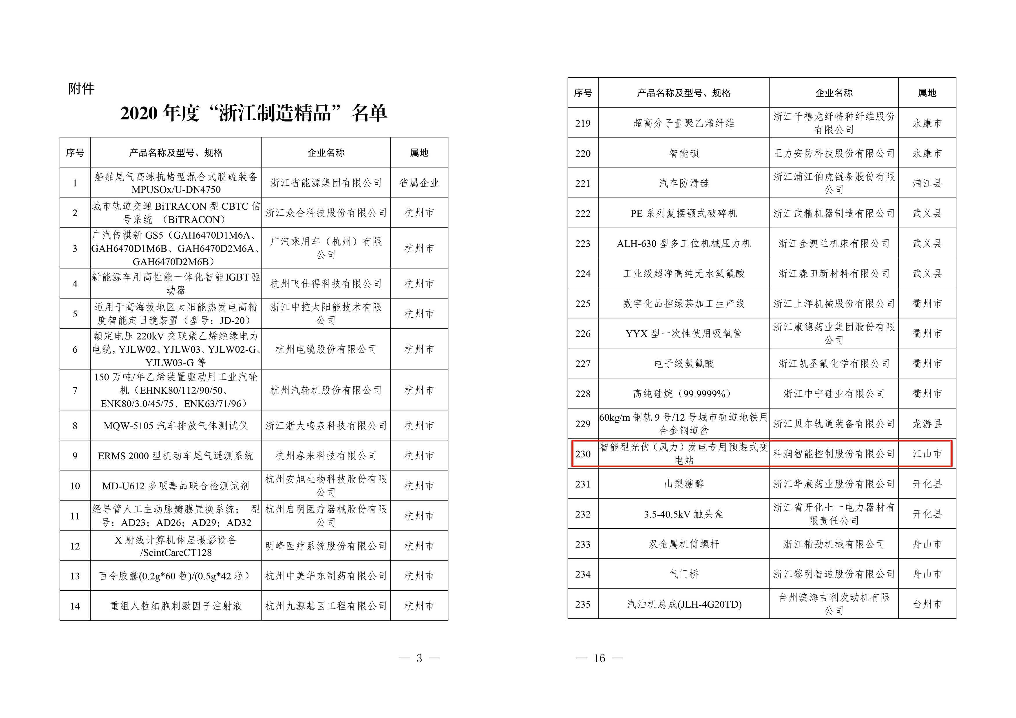熱烈祝賀公司“智能型光伏(風力)發電專用預裝式變電站”產品被浙江省經信廳認定為2020年度“浙江制造精品”!
