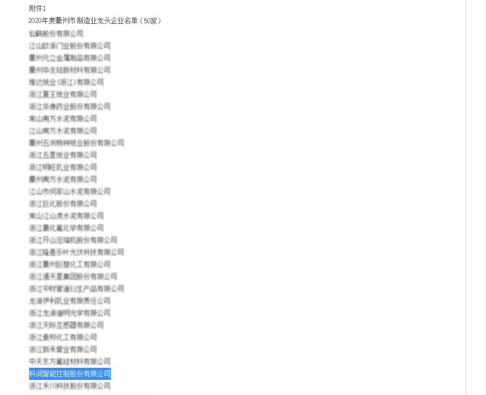 熱烈祝賀科潤智控獲評2020年度衢州市制造業龍頭企業