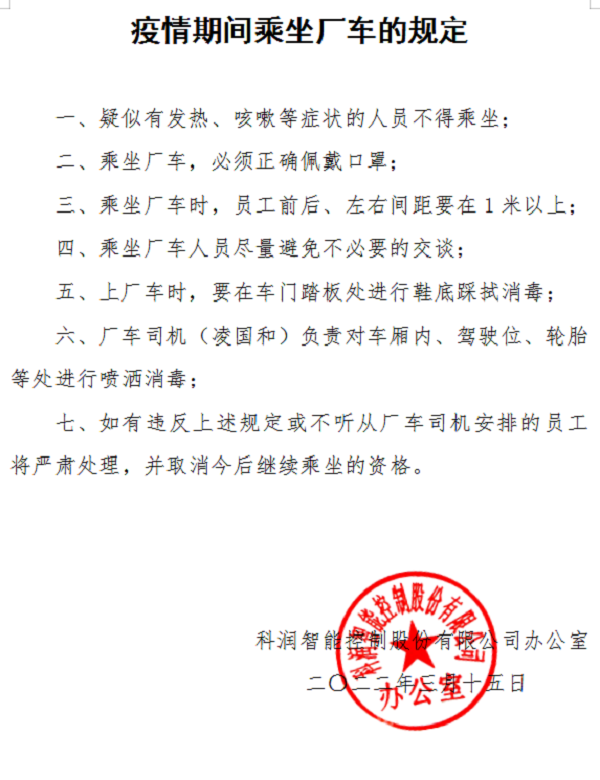 及時轉發衢州發布、江山發布等載體關于新型冠狀病毒防控常識、核酸檢測注意事項和最新疫情通報等,教育引導廣大員工以科學的態度認識疫情,并發出告員工通知書,號召全體員工用實際行動,共同守護幸福家園,展現科潤智控全體員工的擔當和力量。截止3月17日,公司全體員工已全部完成第一輪核酸檢測;對外來人員和車輛出入嚴格控制,要求正確佩戴口罩、掃碼、測溫、消毒、登記、查看48小時核酸報告;公司全域消毒;食堂錯時就餐,排隊間距控制在一米等。