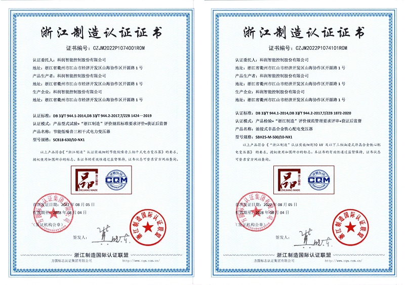 8月5日,科潤智能控制股份有限公司的兩款產(chǎn)品----節(jié)能低噪音三相干式電力變壓器、油浸式非晶合金鐵心配電變壓器獲得“品字標(biāo)浙江制造”認(rèn)證。
